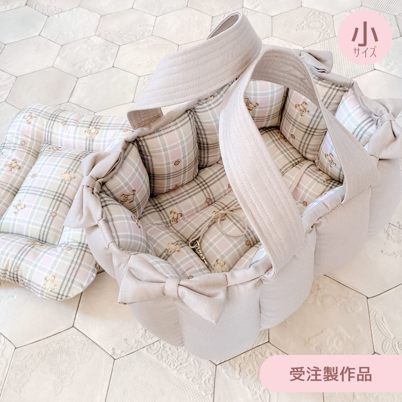 【受注製作品】ポティロン・バスケット(小) / グレージュ&くま(取り外しクッション1つ・リードフック1つ付き)