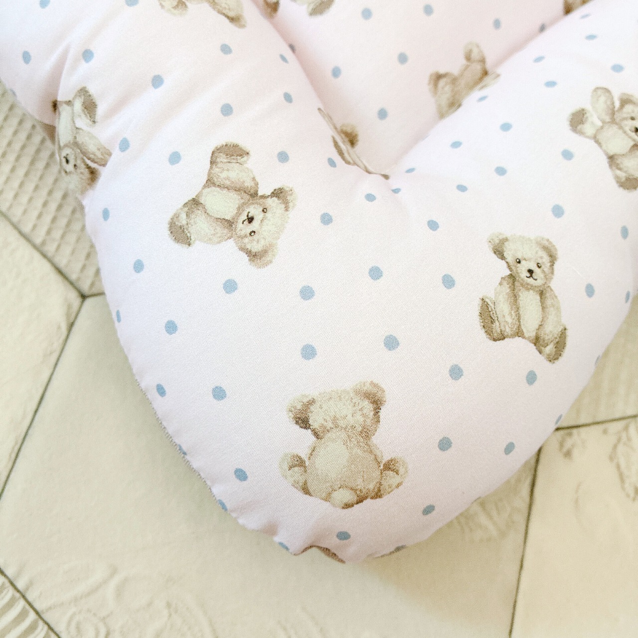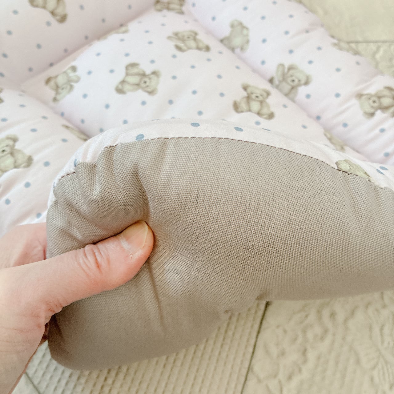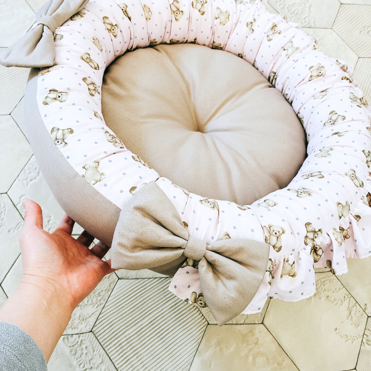 ピンク系くま柄生地とグレージュ無地生地を組み合わせて作りました。