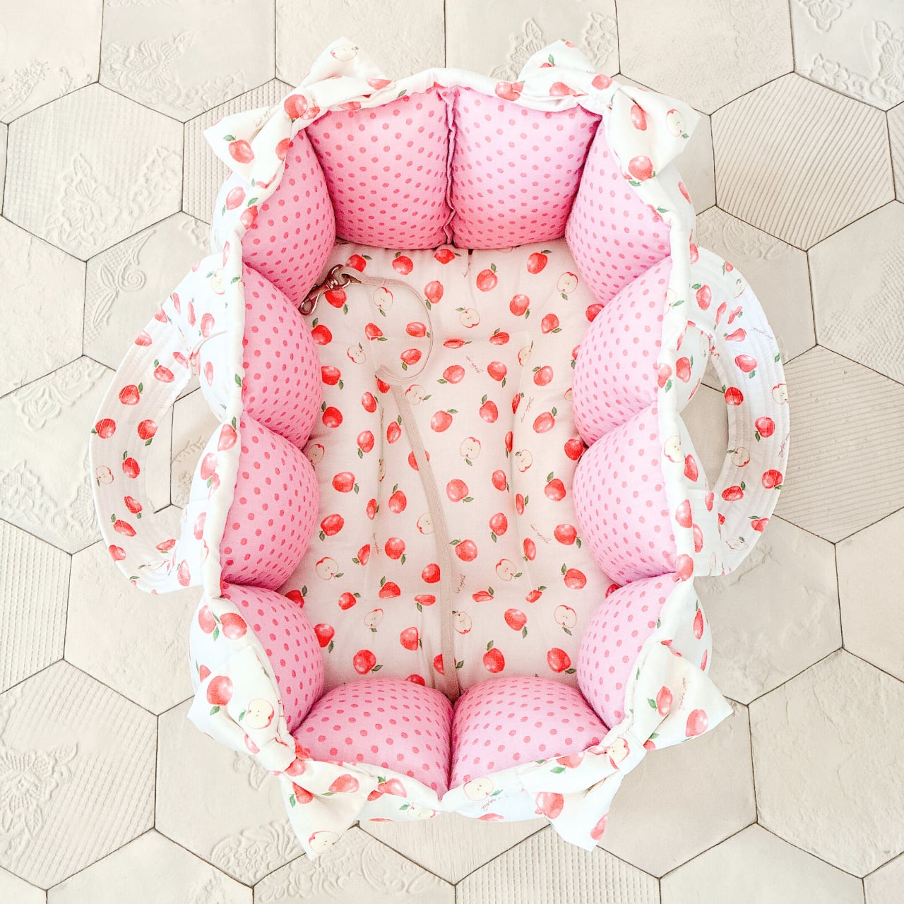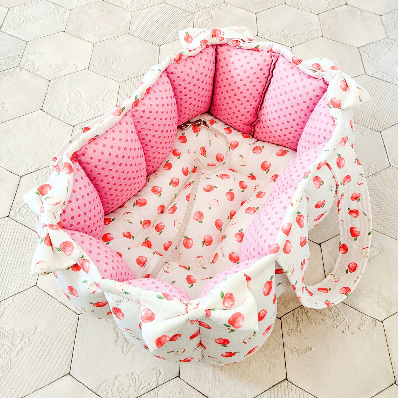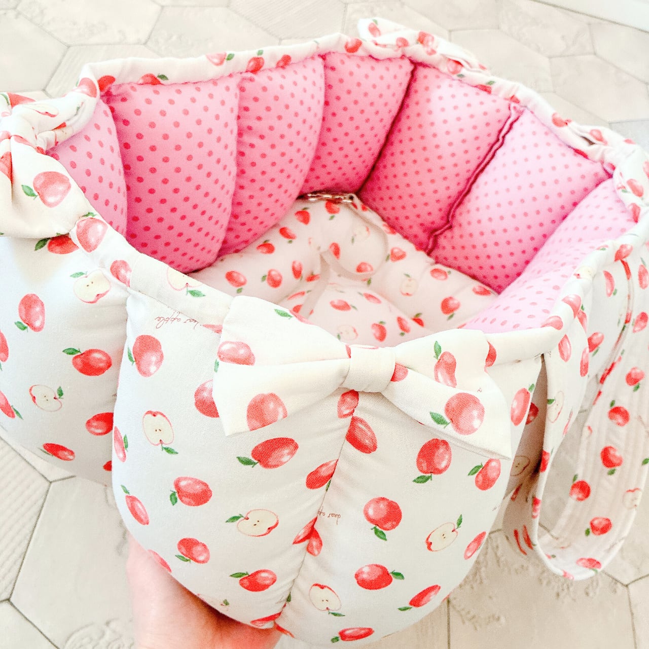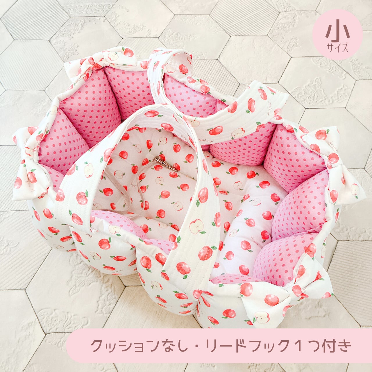 表生地はりんご柄、内側生地はピンク系ドット柄を使って作りました。
