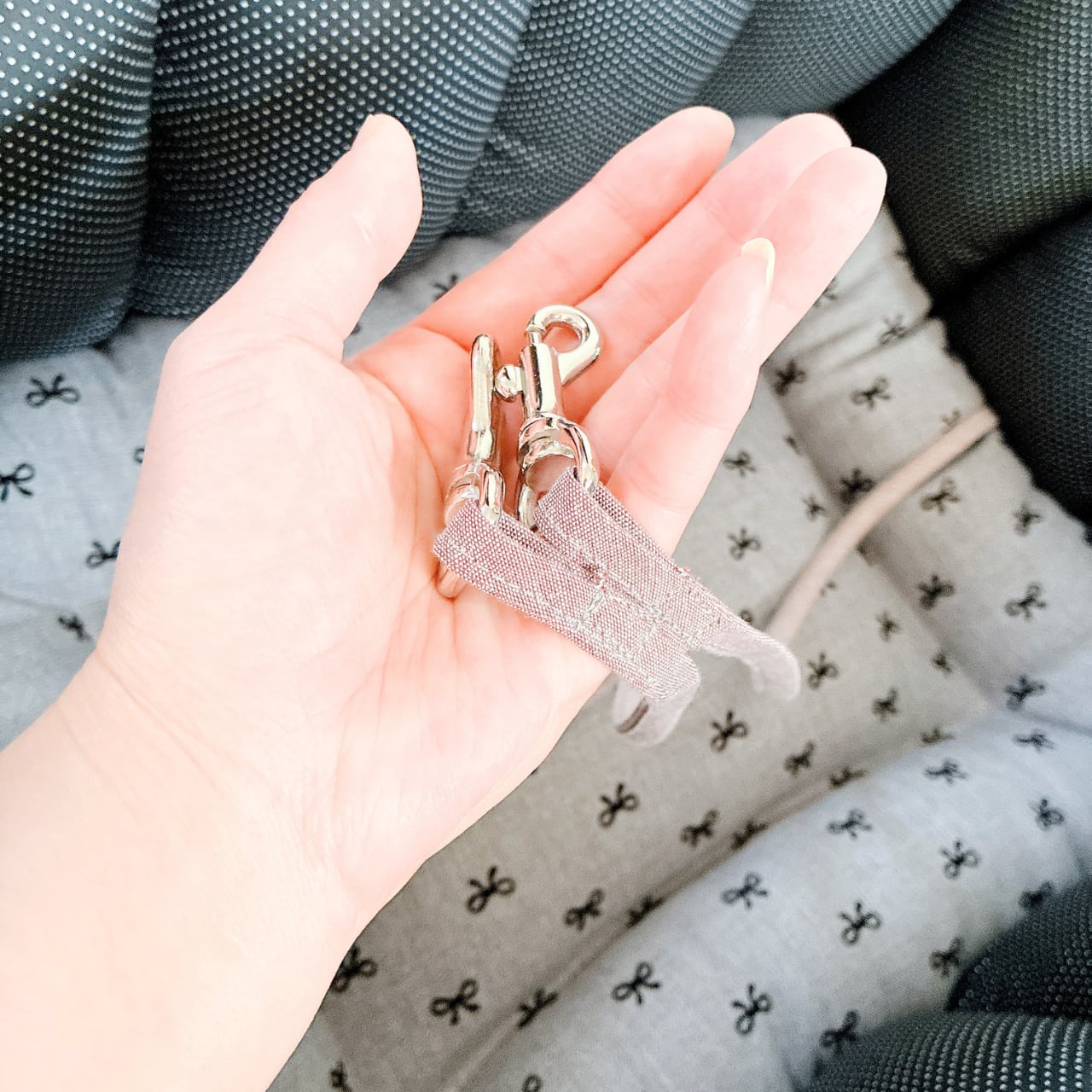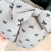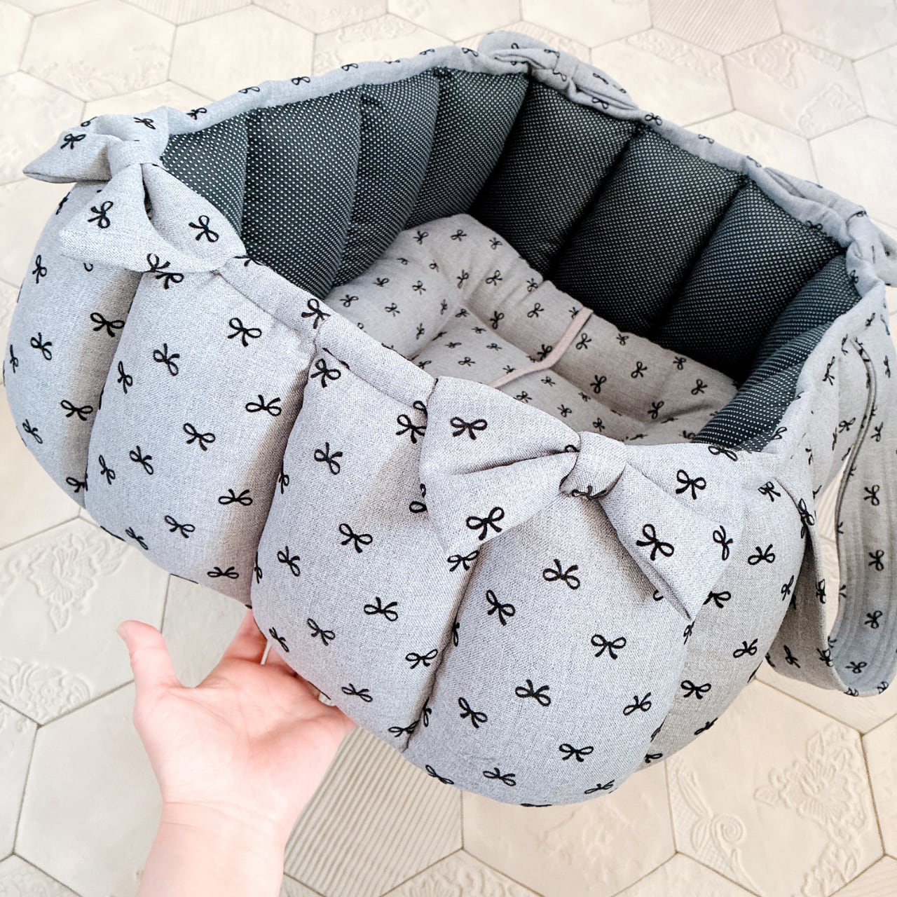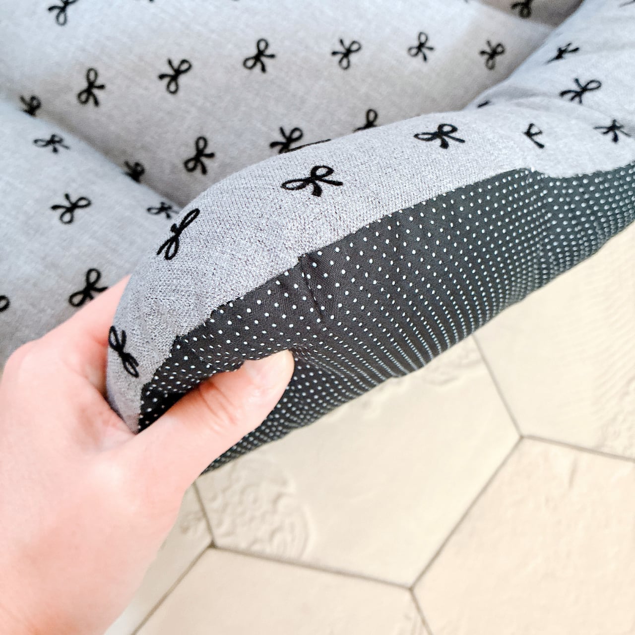 表生地はグレーベースにリボン柄、内側生地は黒系のミニドット柄を使って作りました。